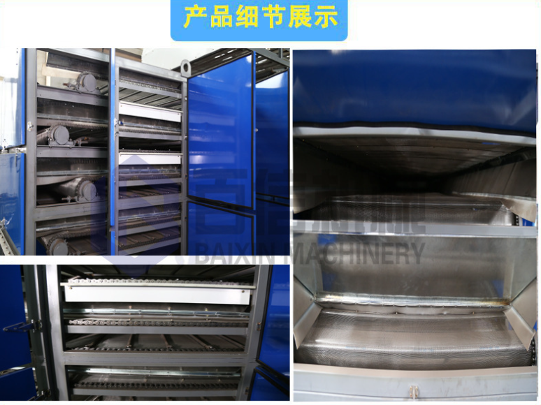 烘室為箱體式,承載物料的網(wǎng)帶為不銹鋼網(wǎng),機(jī)門為鍍鋅鋼板,表面噴漆保護(hù),中間鑲嵌保溫材料。 鏈條為合金鋼套筒滾子鏈,速度兩級(jí)設(shè)計(jì),前快后慢,能滿足不同干燥工藝要求。